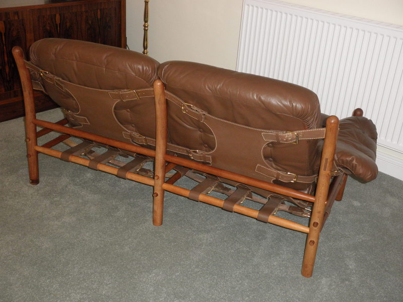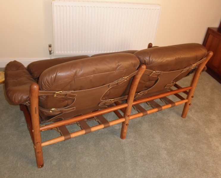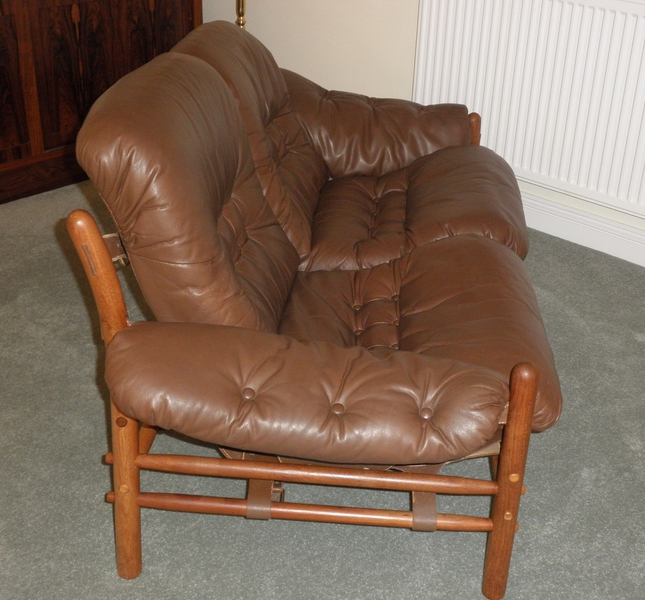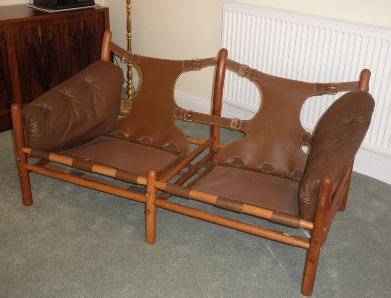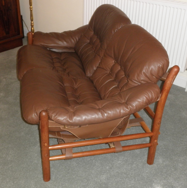 Swedish designer first opened a workshop in Stockholm in 1954, before moving to Småland in 1958 where he started the Möbel AB Arne Norell company from where furniture, including many of the original designs, continue to be produced under the Norell Möbel AB label today. In addition to being posthumously awarded the 1973 British Furniture Manufacturer’s “Showpiece of the Year” for his Ari chair design, Norell is highly regarded for the use of traditional materials, in particular, combining leather with turned and bentwood frames; a technique, superbly illustrated in the Ilona style seen here and other designs such as the Inka armchair, Indra & Kontiki sofa – all are collapsible and use leather strap supports to hold the light wooden frames together.