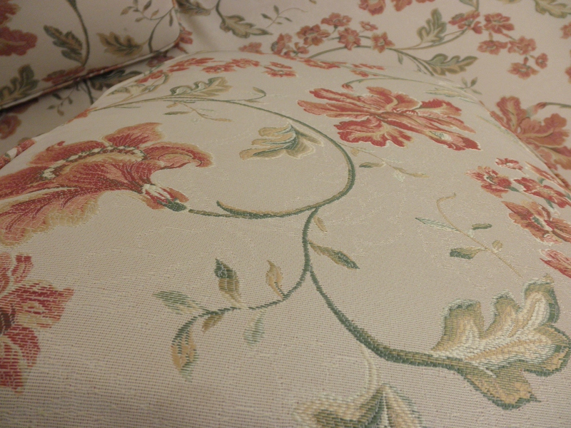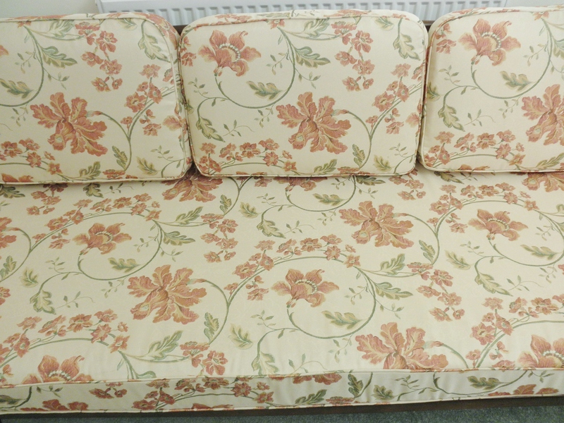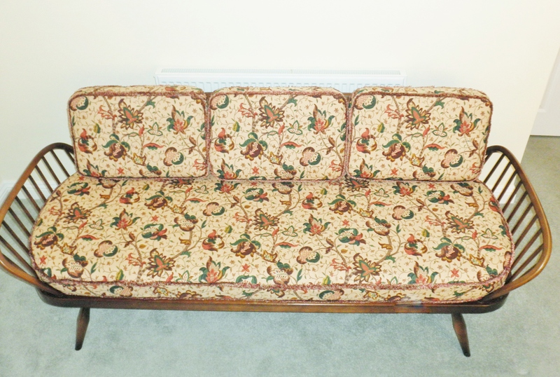 This labelled, Ercol Studio Couch or Day Bed, Model 355 in Ercol’s Old Colonial finish still retaining the original 1970s linen covers beneath the as new replacement covers by Plumbs in an attractive heavy-duty fabric of trailing orange flowers on a cream background – a mixture of acrylic, polyester and cotton.