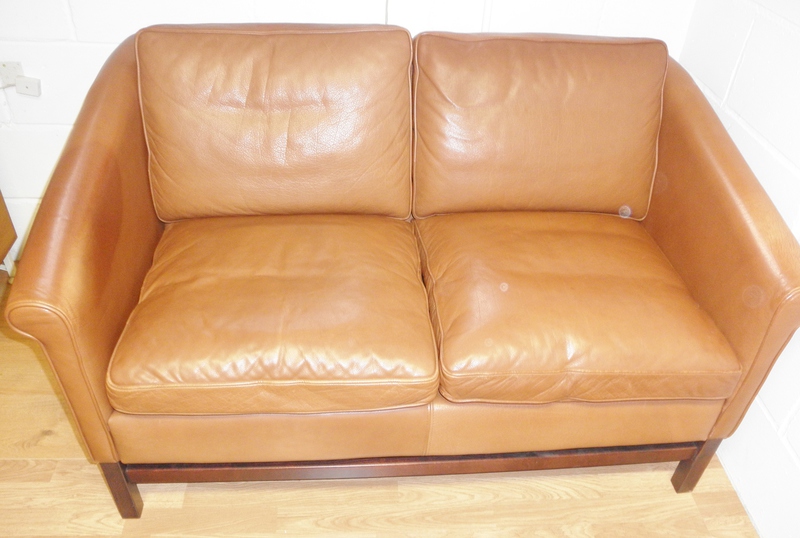 A mid 20th century, compact and very comfortable, stylish Borge Mogensen design, 2 seater Danish settee by Stouby Polster Møbelfabrik in piped tan coloured leather on solid, dark wooden legs with a stretchered frame. The cushions are filled with goose down adding to the comfort and are in excellent condition. Modest staining and minor graze on one arm at top back corner.