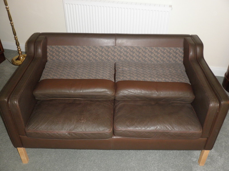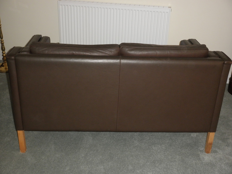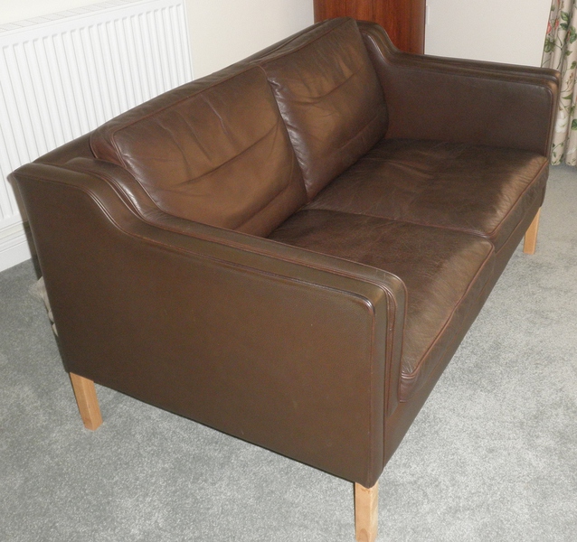 A Danish classic two-seater sofa made by Stouby in the Borge Mogensen design – Model No. 2212 – Eva style. Raised on a beech frame this settee is completely tear free with only minimal signs of age-related use and features the original high-quality brown leather upholstery with piped seams and cushions.