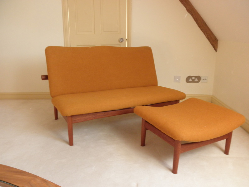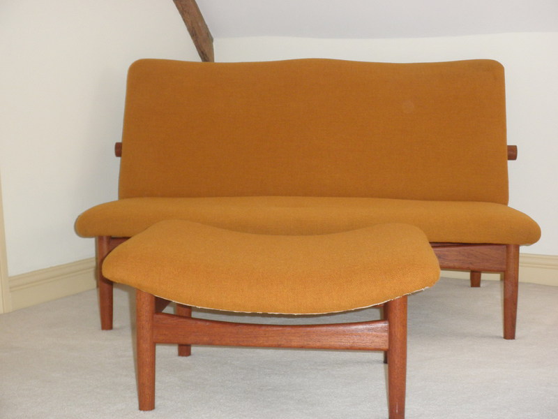 A completely original set designed in 1953 by the highly regarded Danish designer, Finn Juhl (1912-1989) and made by France and Son. This iconic and highly collectable 2-seat sofa, with a matching footstool, known as the Japanese sofa and is said to have been inspired by the Torri gate or Miajima water gate off the coast of Itsukushima Island near Hiroshima which appears to float.