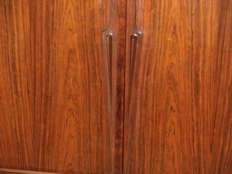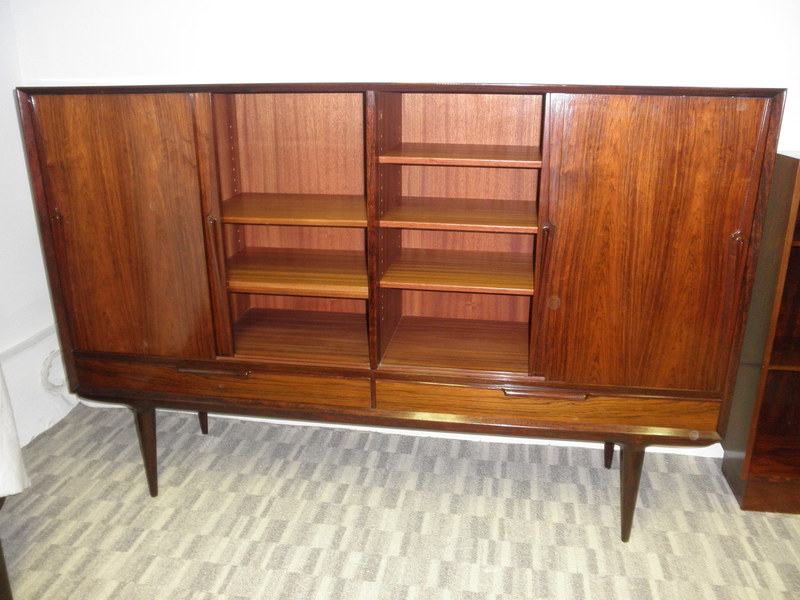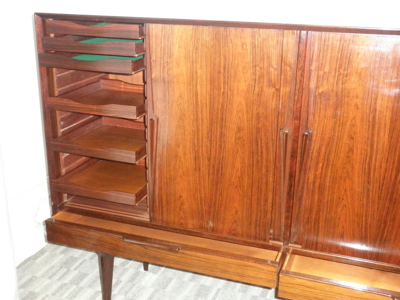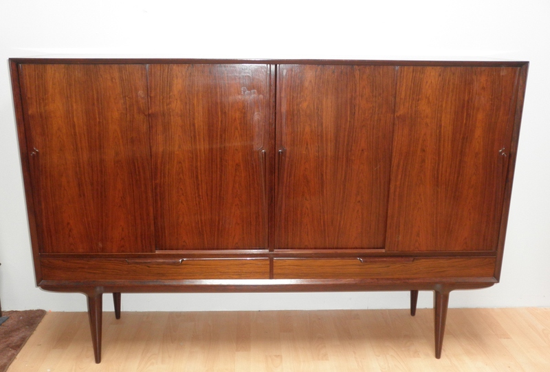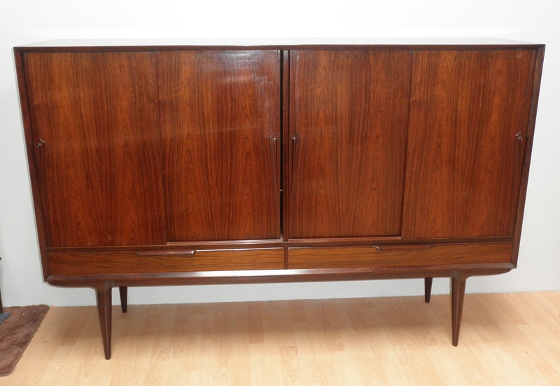 Designed by Gunni Omann in 1961 and produced by Omann Jun, Denmark, this Model No. 13, high sideboard is an elegant and beautiful piece of mid-20th Century rosewood furniture. Raised on finely turned legs and stand the cabinet features stylishly sculptured handles and comprises 4 sliding doors enclosing baize-lined inner drawers to one section and various shelves above 2 half-width lower drawers. The unit has a beautiful patina and is in exceptionally good condition throughout.