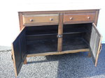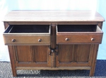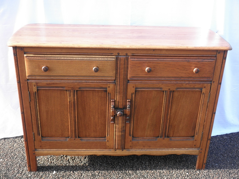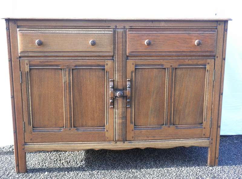 In a style similar to a buffet or court cupboard, this early Ercol sideboard is in excellent condition considering it was probably produced around the mid-1950s and, although there are a few marks here and there, the patina indicates careful use by the previous owner. Comprising two drawers above a two door cupboard (enclosing a full-width shelf) with a sliding wooden bolt fastener.