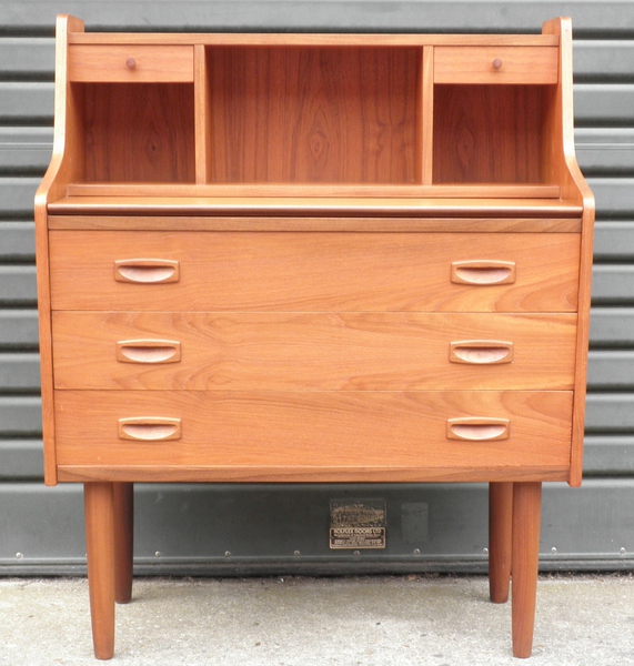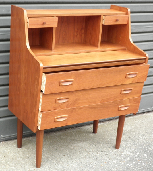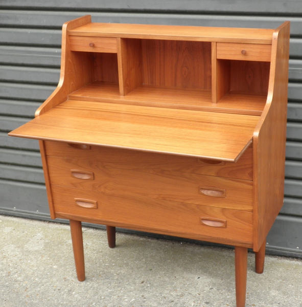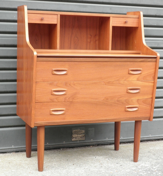 A compact Danish teak bureau / writing desk raised on solid teak legs and comprising dovetailed drawers with beech linings throughout which includes two small drawers over pigeon-holes either side of a central recess and a pull-out surface above three full-width drawers with inset handles.