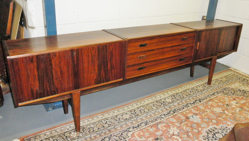 A very rare and long, Danish rosewood modular sideboard raised on stretched legs and comprising three sections, with a bank of three central drawers flanked on either side by a hinged and lockable double cupboard and another double cupboard with sliding doors with internal shelves. The relatively shallow profile of this mid-century modern sideboard emphases the length and elegance of this very attractive piece which is in excellent condition throughout.