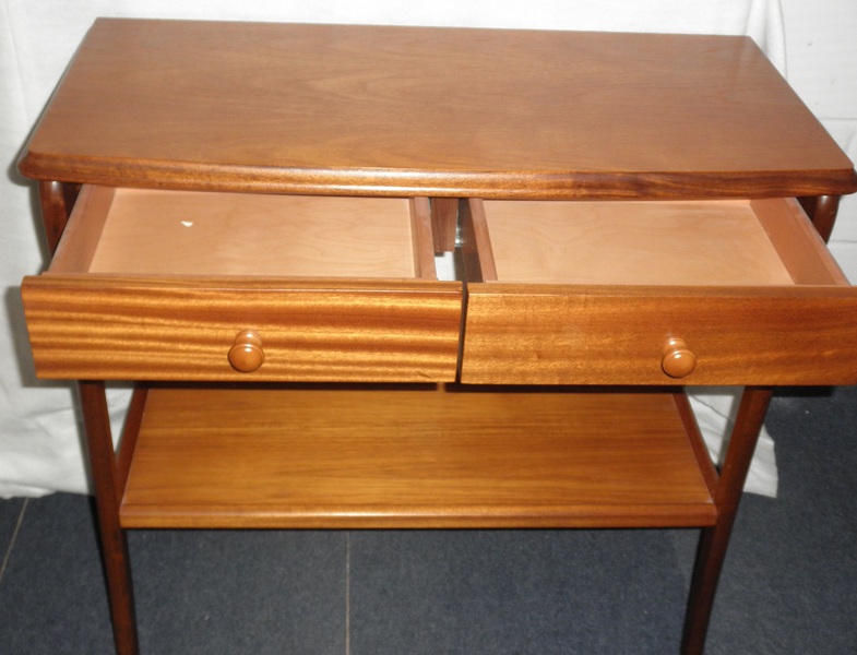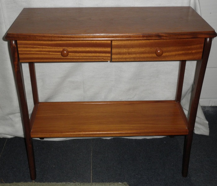 A small and very neat, teak console table with a bow front above 2 drawers over a lower shelf standing on attractively shaped legs of a slightly darker shade of teak. Possibly late 1970s/early 1980s, the unit is from the Sutcliffe Trafalgar range and is of excellent quality and in immaculate condition.