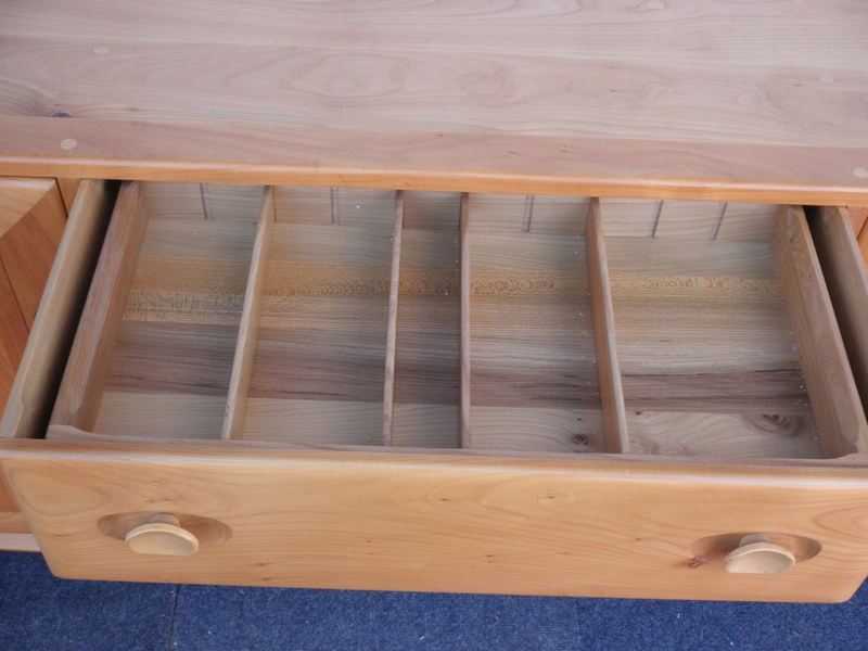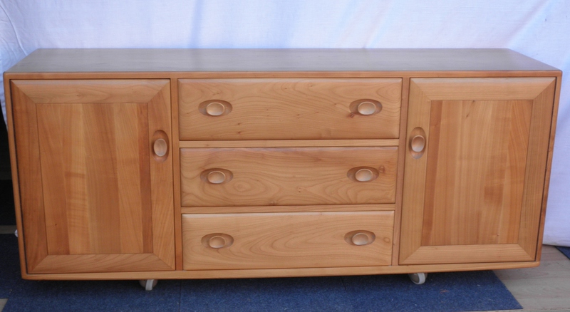 A very popular design by Ercol - a style featured in the Ercol Silver Jubilee Exhibition, Hyde Park - is this Ercol Model 455 sideboard (circa 1977) raised on sturdy castors with a panelled back so that it can be positioned anywhere in the room, or even as a room divider. An extremely light finish example with the distinctively stylish oval inset handles, having three central dove-tailed drawers; the top drawer currently housing a full-width, removable cutlery tray with adjustable sections. The drawers are flanked on either side by two cupboards, each containing an adjustable shelf. The sideboard is in exceptionally good condition throughout with all the original hinges and castors operating smoothly and only one minor mark on the top surface (see photo).