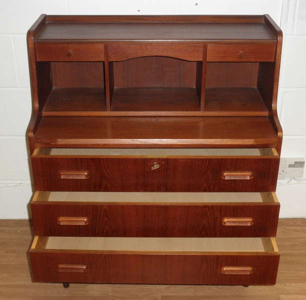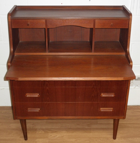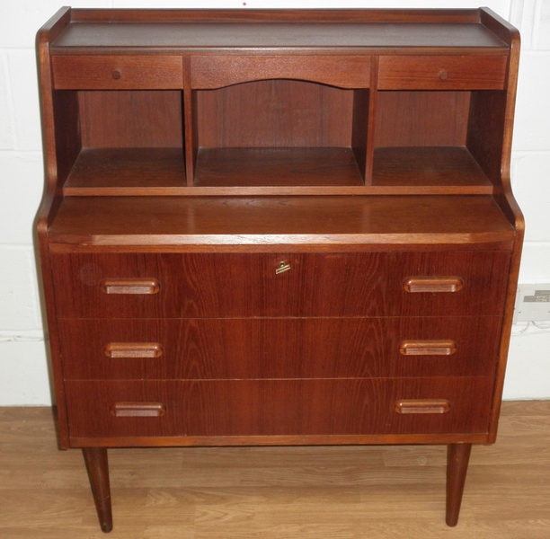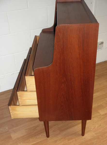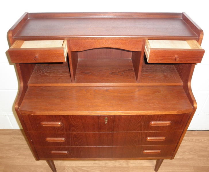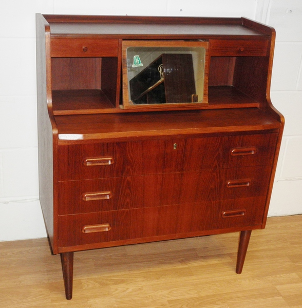 A rather special 1960s Danish teak bureau in the highly regarded Arne Wahl Iversen design featuring a pull-out or foldaway copper-backed and labelled mirror by AG Spejl Kobberbeskyttet transforming the bureau into a dressing table as required. In beautiful condition with the centrally positioned mirror being flanked by two small drawers over three pigeon holes. The top section includes an attractively chamfered and shaped pull-out writing surface above the bottom three full-width, dovetailed drawers with inset handles. The top drawer being lockable and retaining the original key. Raised on tapering round legs with beautiful figuring in the teak and apart from a very feint ring mark on the very top (see photo) that does not detract from this superb piece which otherwise is in excellent vintage condition.