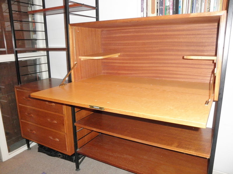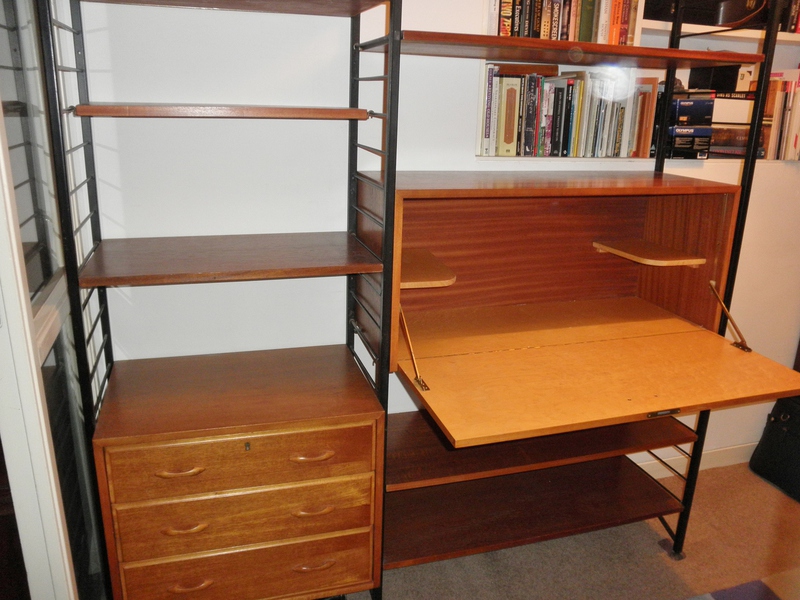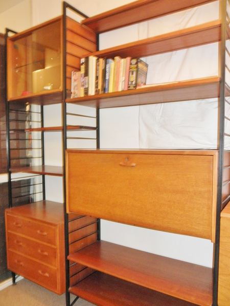 New to the market since original purchase in the 1960s, this very practical layout of a Staples Teak Ladderax system, labelled: Ladderax Unit Furniture, Cricklewood, with 3 metal ladder uprights forming 2 bays; includes one section comprising a display cabinet with original glass sliding doors and glass adjustable internal shelf, above 1 narrow and 1 deep shelf over a triple drawer unit. The second bay comprises 2 narrow and 3 deep shelves distributed around a fall-front writing bureau (or drinks cabinet) housing 2 internal quarter shelves. All in very good condition with minimal signs of wear commensurate with age and careful use.