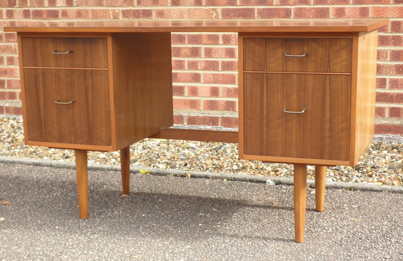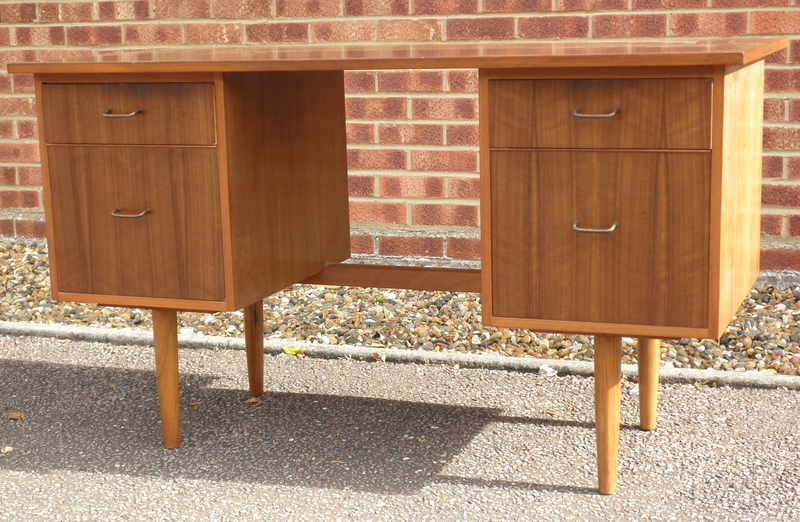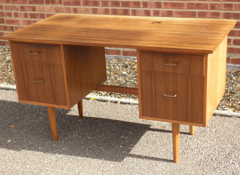 A mid-20th century kneehole desk flanked by pedestals of dovetailed drawers (the top one being relatively shallow above a lower deeper drawer) with metal drawer pulls and raised on nicely turned legs. Made from a very nicely patterned light walnut in a stream-lined design, the desk has a generous and original writing surface with a wonderful patina from years of good use which is not marred by some commensurate fading and an ink stain being evident which we consider adds to the overall charm and authenticity of this original, unrestored piece.