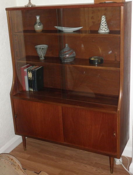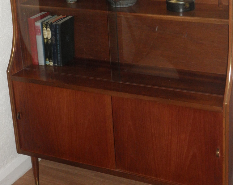 An early mid-20th century compact and pretty teak display unit, with brass inlay high-lighting the front edges. The lower cupboard section has 'D' or half-moon brass handles to both sliding teak doors. Sliding glass doors enclose the 2 shelves of the top section. The unit stands on four tapering legs with brass capped feet.