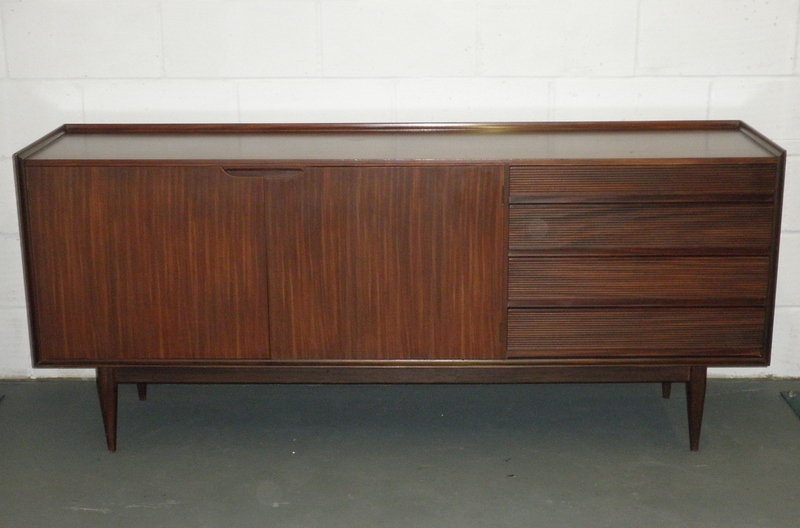 With an attractive, lipped surround, to the top surface, the front edges and echoed along the base of the sideboard. Raised on stretchered and turned wooden legs, and comprising a double-door cupboard (with a recessed opening slot) divided into two sections housing three adjustable shelves and above the right-hand section is the original slide-out tray with a melamine surface for serving drinks. There are also four generous drawers (the top one has the lined cutlery sections) and all have full-width, reeded fronts disguising the discreetly bevelled draw-pulls.