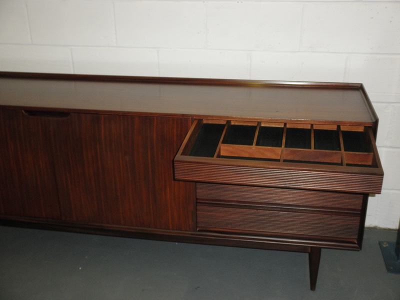A Fine Ladye sideboard dating from the early 1960s, designed by Richard Hornby and constructed entirely in afromosia (dark teak) which is a very heavy and durable hard wood. Later versions of the sideboard were made in teak veneer.