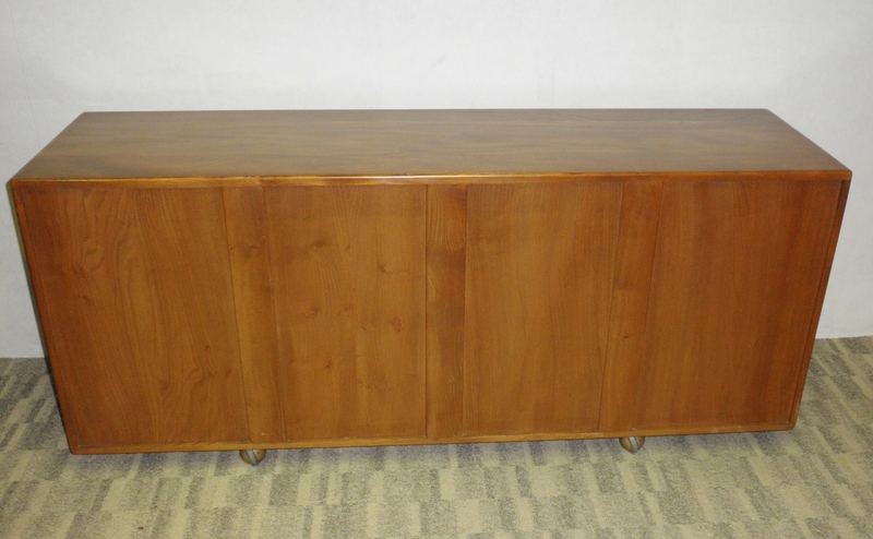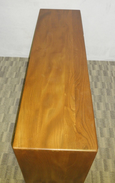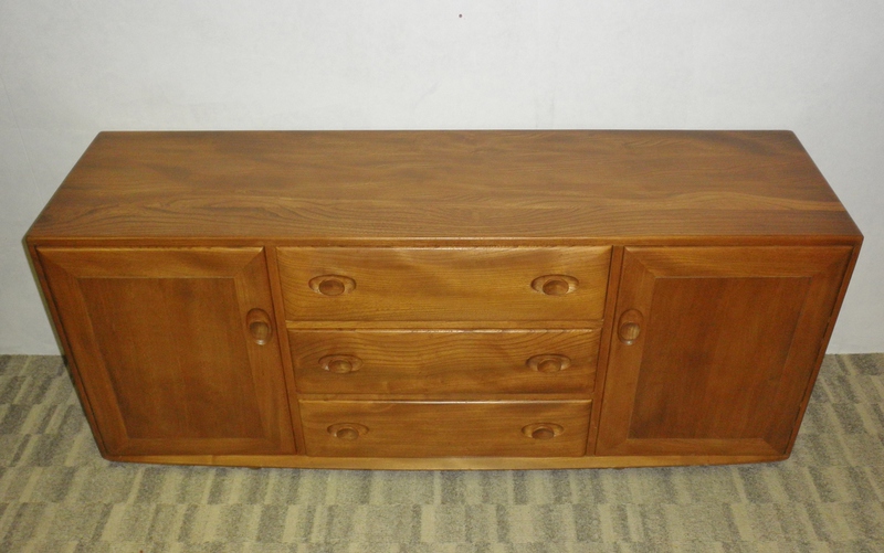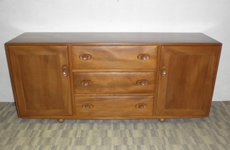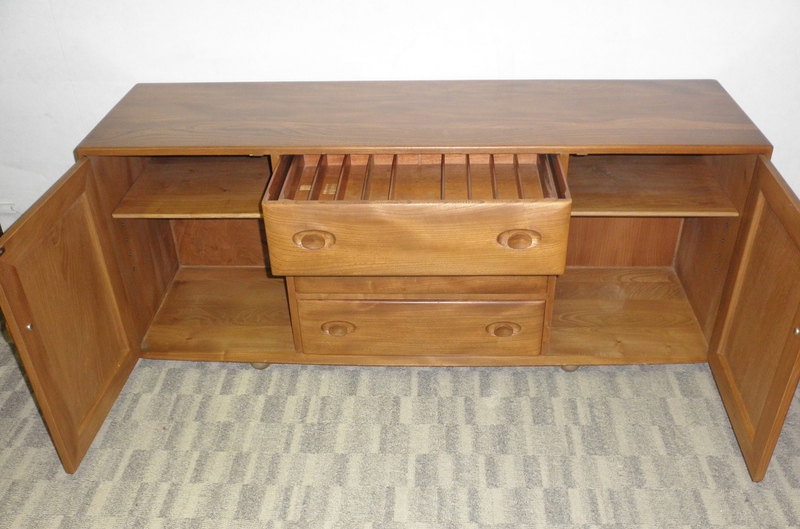 A very popular design by Ercol - a style featured in the Ercol Silver Jubilee Exhibition, Hyde Park - is this Ercol Model 455 sideboard (circa 1977) in a relatively light Golden Dawn finish and constructed in solid elm. Raised on sturdy castors with a panelled back so that it can be positioned anywhere in the room, or even as a room divider, with the distinctively stylish oval inset handles, having three central dove-tailed drawers; the top drawer currently housing a full-width, removable cutlery tray with adjustable sections. The drawers are flanked by a cupboard on either side, each containing an adjustable shelf. The sideboard is in exceptionally good condition throughout with all the original hinges and castors operating smoothly and minor compression marks here and there on the top surface.