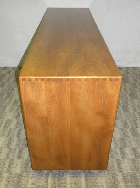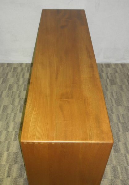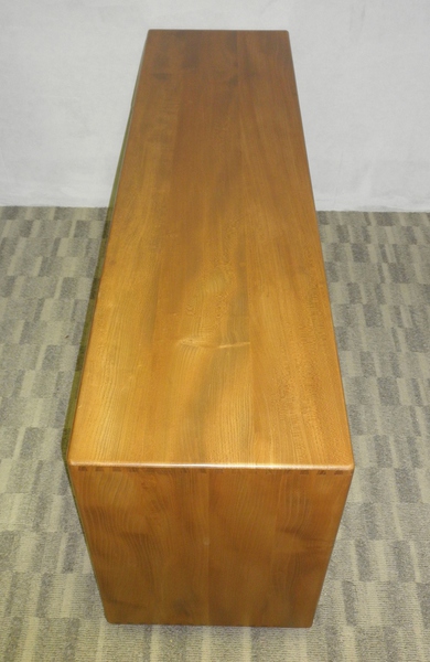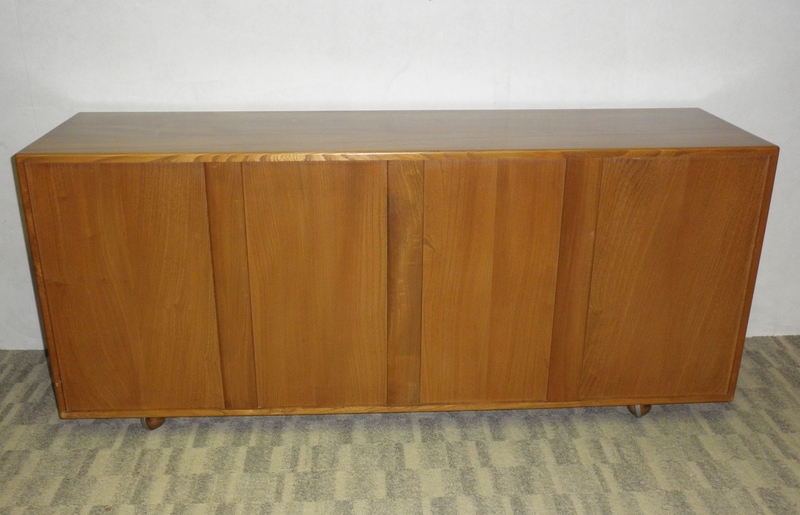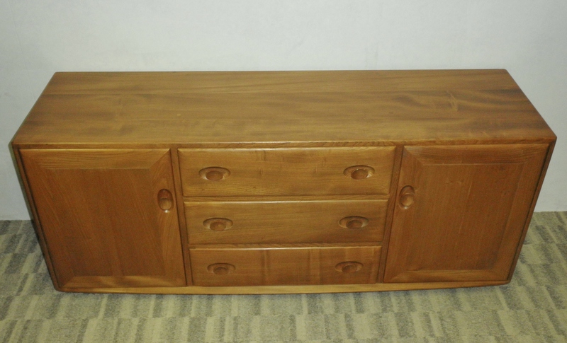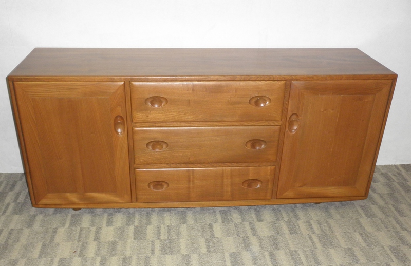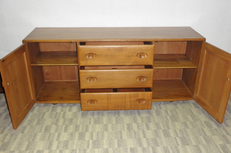 A very popular design by Ercol - a style featured in the Ercol Silver Jubilee Exhibition, Hyde Park - is this Ercol Model 455 sideboard (circa 1977) in the Golden Dawn finish (a slightly more golden finish than the sideboard featured in Item S 66) and constructed in solid elm. Raised on sturdy castors with a panelled back so that it can be positioned anywhere in the room, or even as a room divider, with the distinctively stylish oval inset handles, having three central dove-tailed drawers. The drawers are flanked by a cupboard on either side, each containing an adjustable shelf. The sideboard is in excellent condition throughout with all the original hinges and castors operating smoothly with barely any signs of use.