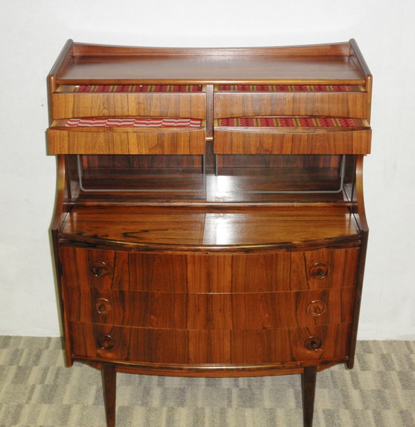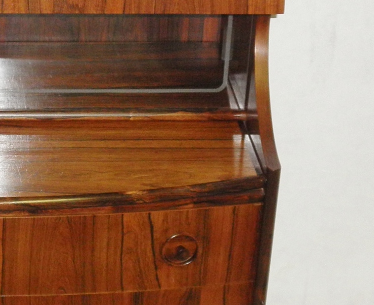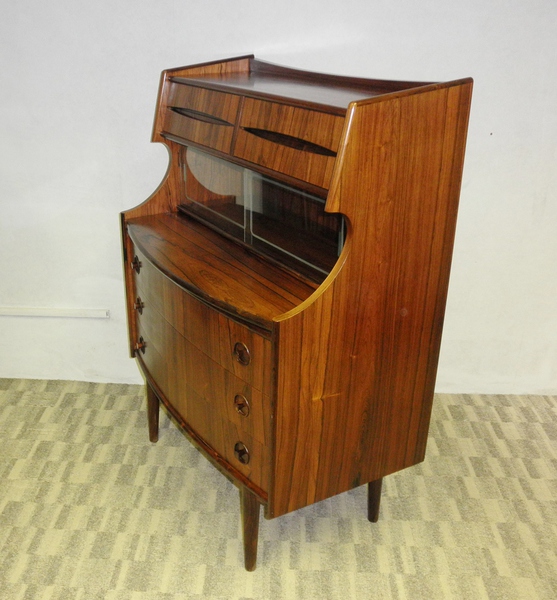 Designed by Gunnar Falsig and dating from the 1960s this handsome Danish bureau / secretaire in pleasingly patterned rosewood veneer with beech lined drawers. Raised on solid rosewood legs, with four small top drawers above a shelf enclosed by two glazed sliding doors over the bow-fronted writing slide (perfect for using with a laptop) and the lower bow-fronted three full-width drawers each having two delightfully turned handles set within sculpted discs.