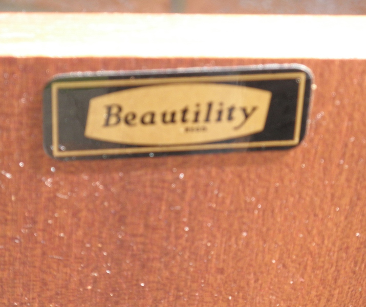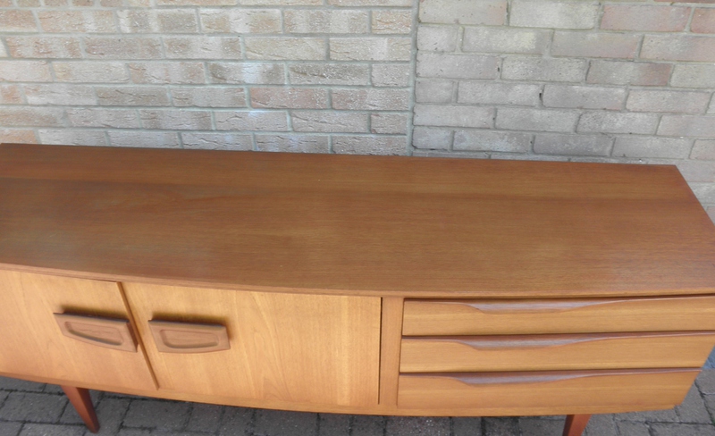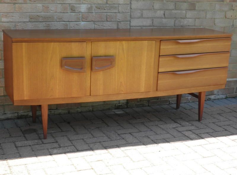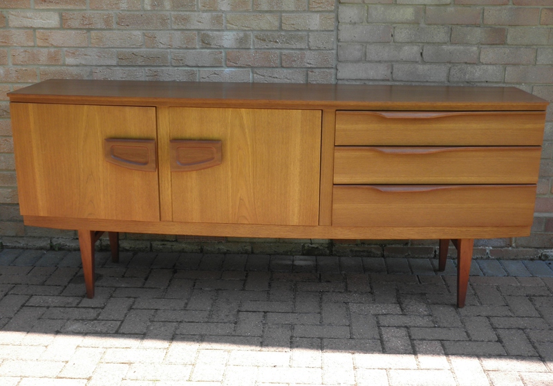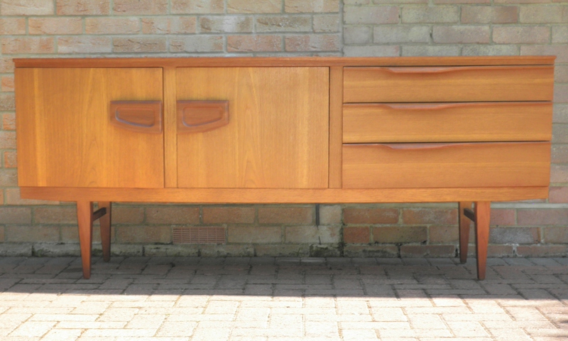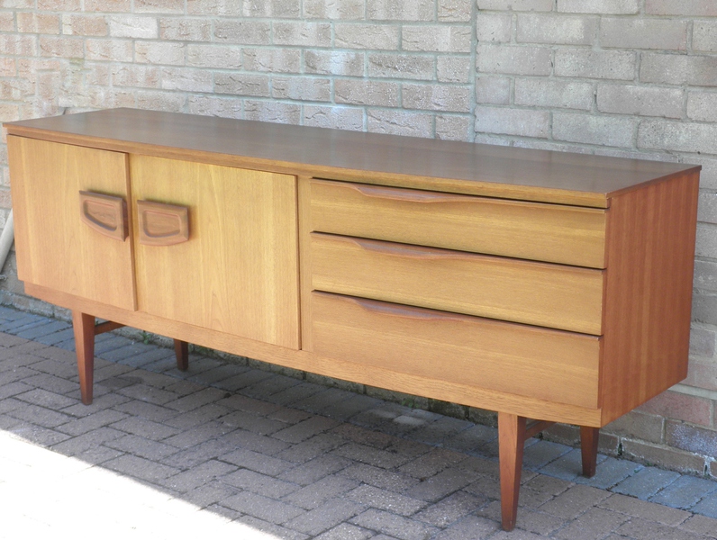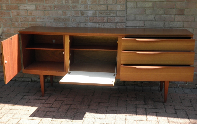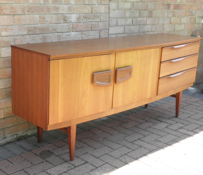 As with many of Beautility sideboards, this fairly light-coloured teak version also makes a special feature of the attractively shaped handles on the two cupboards, each with an internal shelf and one being a drop-down door with a melamine surface to the drinks section. Three generous drawers accentuated by the lipped handles complete this very attractive piece raised on tapering and sturdy square shaped legs.