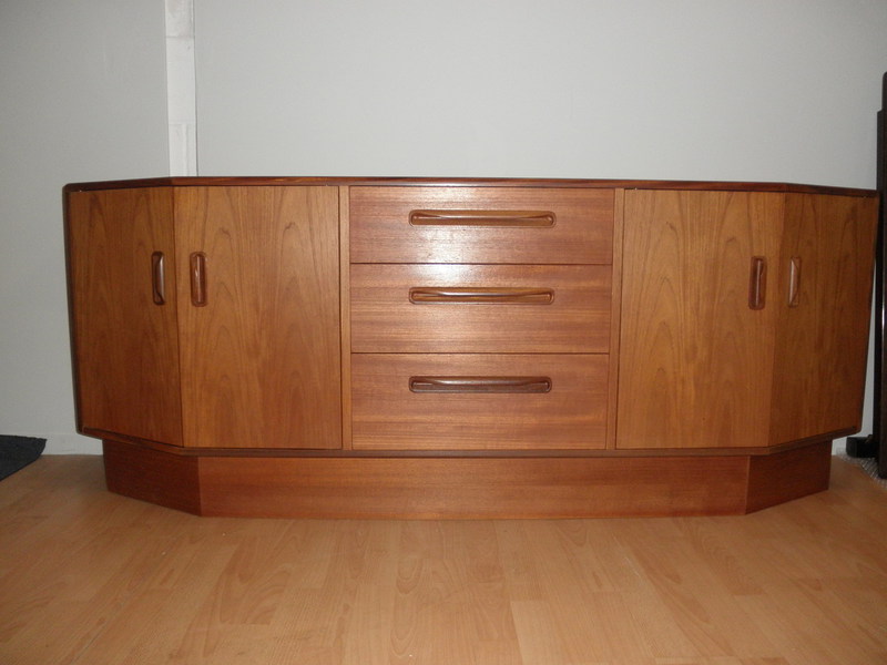 Part of the G Plan “Fresco” range. This design with angled ends to either side is a good space saving feature yet provides plenty of capacity in the two, double-door cupboards and 3 good-sized drawers to the centre. Sideboard shows virtually no signs of wear, all surfaces and fittings are all in really very good condition.