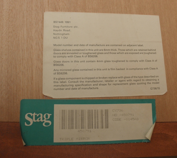 A completely original Stag dressing table from the early 1990s in a light mahogany with a glass top, detachable triptych set of mirrors and an attractively upholstered matching stool. This set is in wonderful, original condition featuring two drawers (with brass escutcheon swan neck drops) either side of the kneehole, above which is a discreet pull-out trinket/pin tray. The bevelled edged dressing table surface appearance has been beautifully preserved by the glass top which is also in extremely good condition. The light mahogany framed triptych mirrors (central mirror pivots) are detachable and overall the condition is excellent with only minor fading as to be expected.