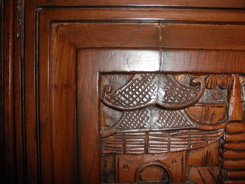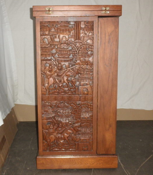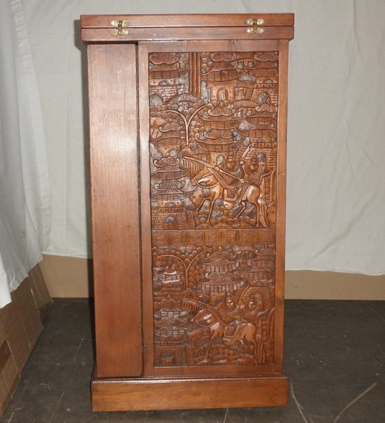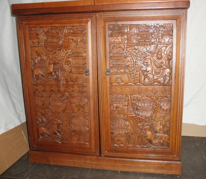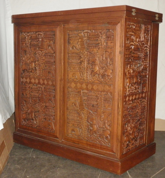 A 1970s, solid teak foldaway cocktail cabinet, heavily carved with oriental scenes to all sides opening to reveal numerous compartments for glassware, a wine rack and a rotating section to hold spirit bottles below the long fold-over bar counter. Raised on castors to allow ease of movement and in very good vintage condition with one carved door showing a modest shrinkage crack that does not detract from the overall excellent appearance.