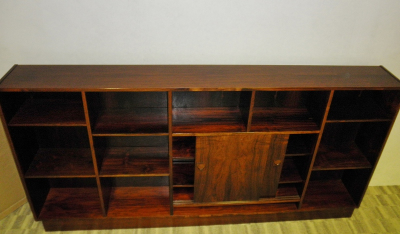Produced by Farso Mobelfabrik in the 1960s, this very long Danish bookcase in beautifully patterned rosewood veneer comprising an arrangement of adjustable shelving providing a variety of display and storage possibilities around a cupboard with interior shelving behind the two sliding doors.