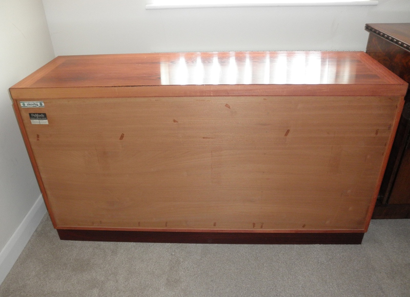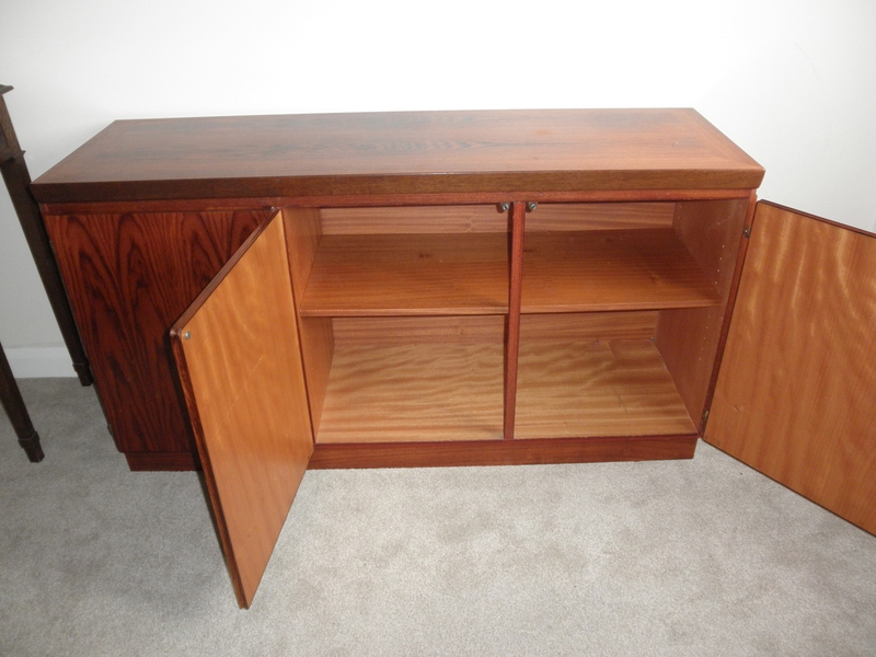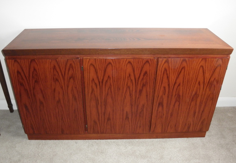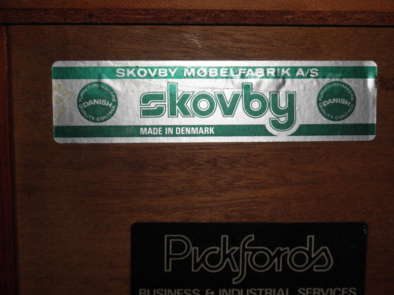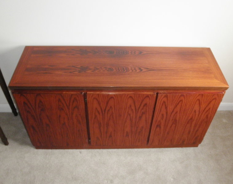 A mid-20th Century Danish three door rosewood credenza / sideboard by Skovby Mobelfabrik (labelled) and dating from the late 1970s. With striking match-book veneer doors that open by top indented groves and feature a double-door cupboard housing a full-width single shelf that can be positioned to suit requirements and on the left is a single cupboard containing five evenly spaced, green baize lined tray drawers. With clean minimalist lines this piece relies on the superb patterning of the wood for decoration with only very slight fading to the beautiful top surface (see photo) that does not detract from the excellent condition of this piece which is suitable for home or office use as required.