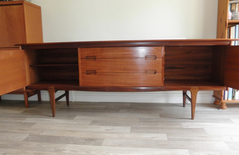 The teak and afromosia is used to good effect in emphasizing the sleek appearance and length of the sideboard, as do the central bank of three drawers featuring inverted drawer pulls and flanked either side by a good-sized cupboard – one with an internal shelf. The top drawer has cutlery dividers and the original green baize lining. The sideboard is labelled and raised on nicely tapered, sturdy legs, and is in excellent condition with some minor fading (see photo) to the beautiful top surface which slightly overhangs the base and, again, emphasises the sideboard length.
