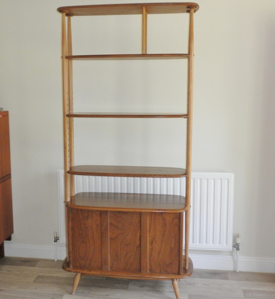 Made from solid elm with beech uprights and distinctively shaped stretched legs with a useful two-door cupboard and adjustable shelf below two adjustable display or bookshelves and a fixed top shelf.