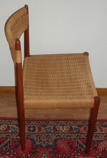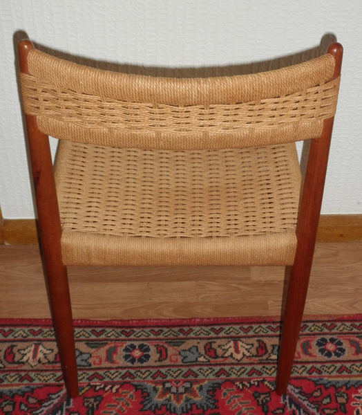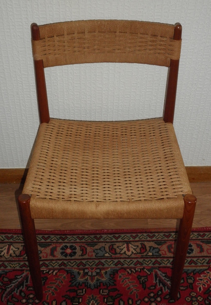 An unattributed Danish chair after a design by Neils O Mǿller with the rounded uprights of the teak frame piercing through the papercord backrest as do the front legs which form the corner posts of the papercord seat. The chair is in excellent condition with minor colour change evident in places on the papercord.