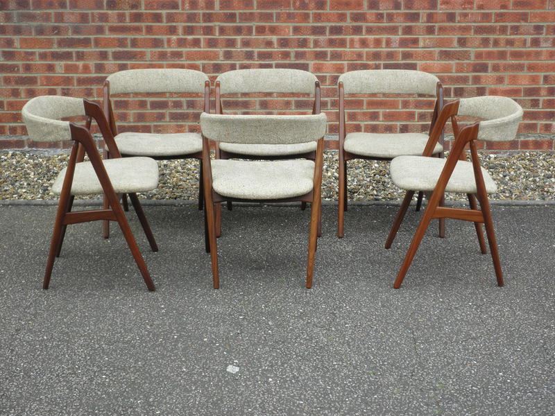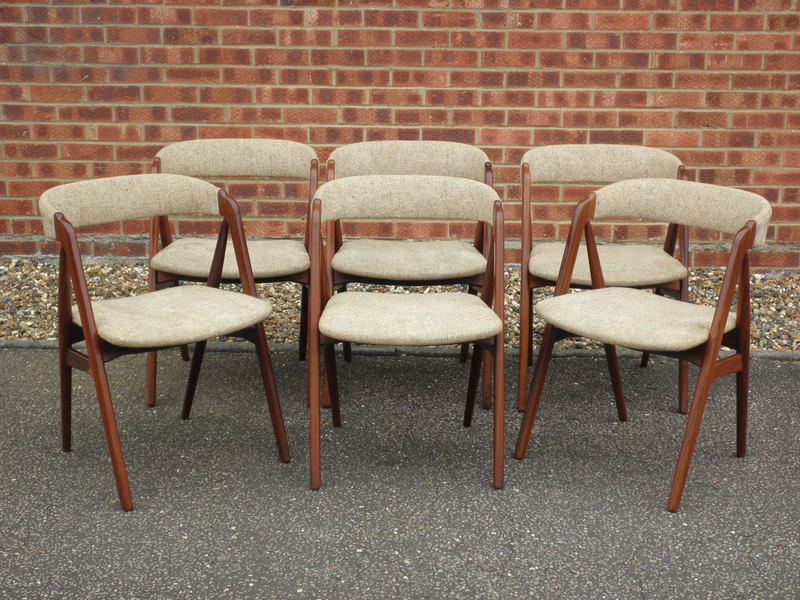 Designed by TH. Harlev in 1958 for Farstrup Stolefabrik, this set of six Danish dining chairs (circa 1960-1969) have the distinctive teak A frame with original oatmeal coloured wool fabric to the seats and hoop shaped back rests. These stylish chairs, bearing the Farstrup Stolefabrik stamp, are all in extremely good condition with sturdy frames and tear free seat cushions and trimmings although would benefit from reupholstery as there are some marks from normal use hence the price.