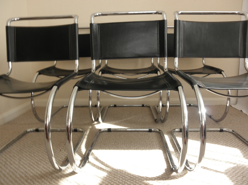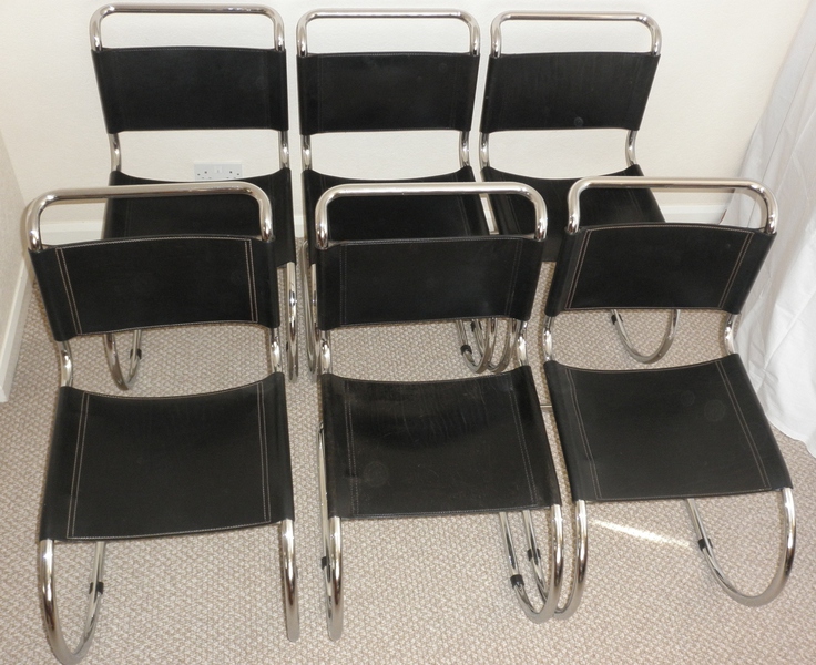 A set of six cantilever MR chairs designed in 1927 by Ludwig Mies van der Rohe (1866-1969). Suitable for use as dining, office / meeting, or even as occasional living room chairs, being made from polished tubular steel forming the cantilever frame with very robust and excellent quality black saddle leather. Whilst these chairs are unattributed, they have adjustable steel tensioning rods to tighten the leather and certainly mirror the early stitched hide version made by Thonet and possibly date from the late 1960s. (They differ from those reproduced by Knoll since the 1970s where the leather is laced).