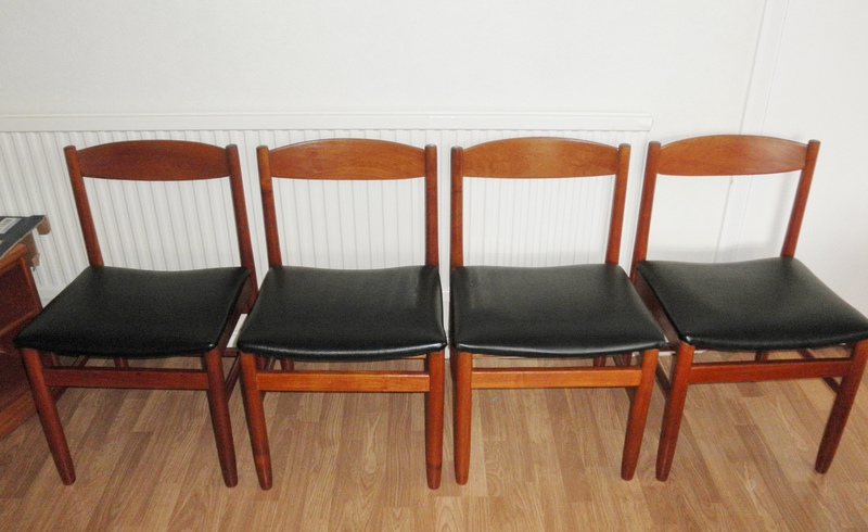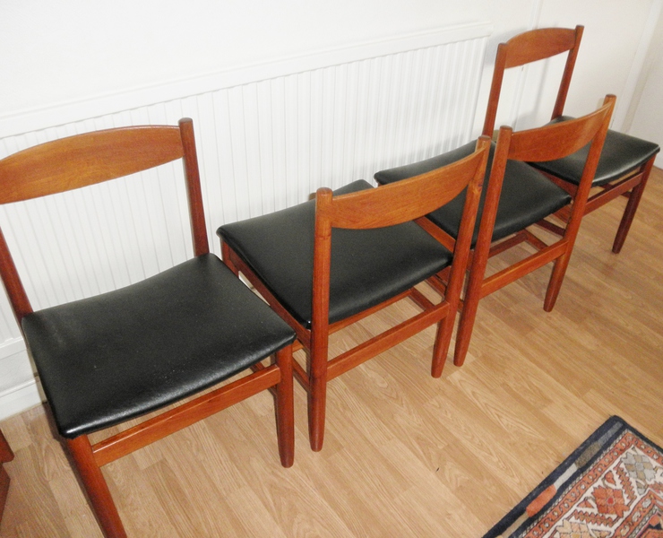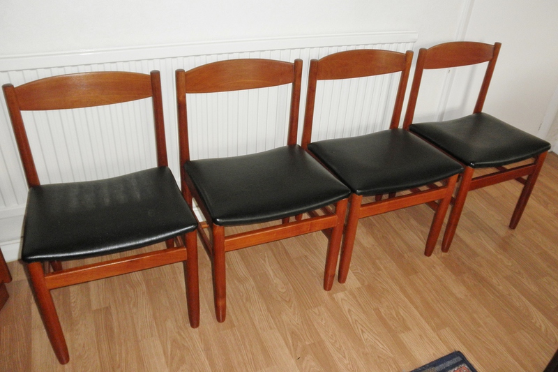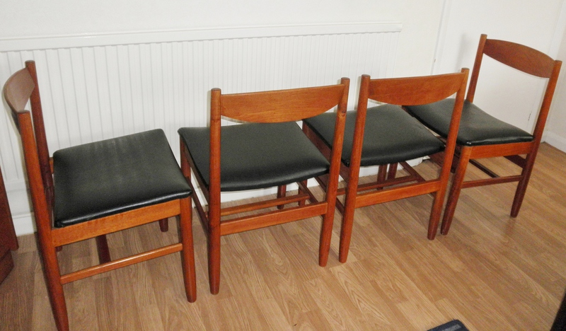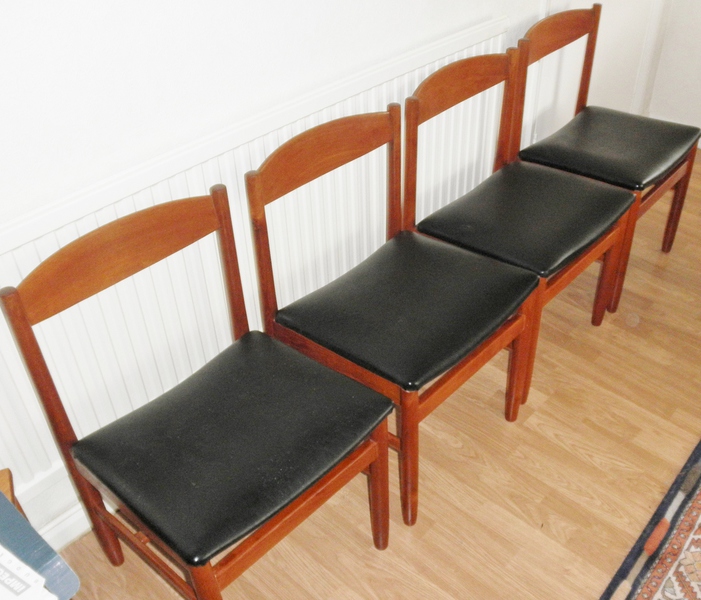 A very sturdy set of four 1960s teak dining chairs, probably Danish but unattributed, having good, clean lines with slightly curving teak back supports and broad, vinyl covered, seats above well stretchered legs. A quality set of chairs with design features that prove their practicality and durability as they are in excellent vintage condition.