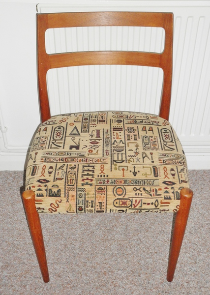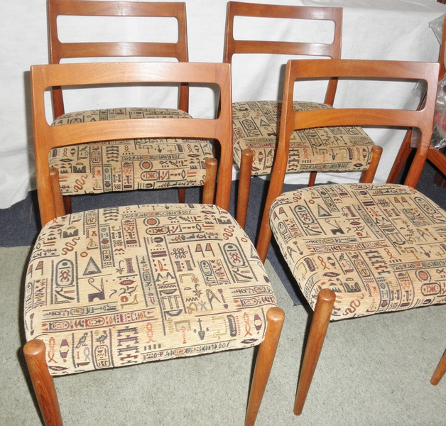 Set of four (mid-20th century) Danish teak dining chairs designed by Johannes Andersen for Uldum Mobelfabrik and covered with the unusual, but very attractive, hard-wearing / heavy duty fabric depicting Egyptian hierogliphs. The back rests are beautifully curved and sculpted, as are the tapering, rounded legs and possibly the broad seats were re-upholstered in the 1970s following the very popular Tutenkhamun exhibition at the British Museum, London in 1972. The fabric is un-marked and the frames are in extremely good order making the sturdy chairs very comfortable and an attractive design which will go well with a variety of teak dining tables.