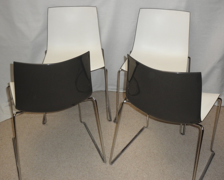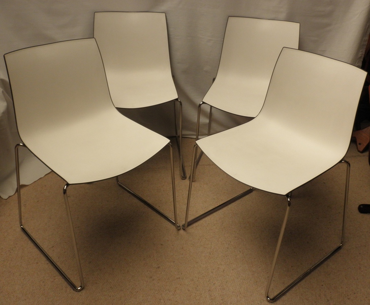 Recipients of the 1999 National Design Award in Spain, Alberto Lievore, Jeannette Altherr and Manuel Molina created this design, with the pioneering technique developed by Arper to produce the double curved, bi-colour polypropylene seats, raised on stackable, chrome finished steel, sled legs. This particular set of four chairs, in as new condition, have a white front and subtle mink/taupe coloured rear making them a very sophisticated and versatile choice to suit a wide variety of colour schemes.