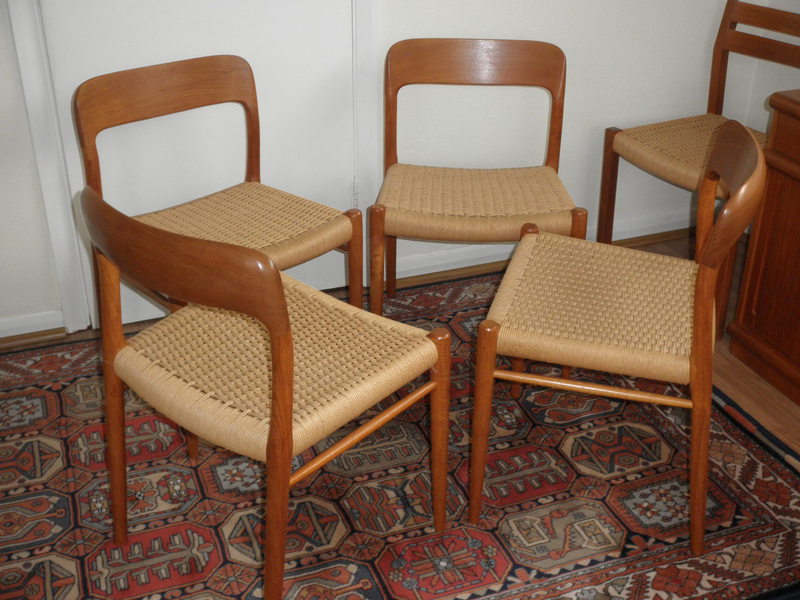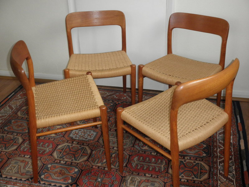 A beautiful and virtually immaculate set of four teak and paper cord chairs, designed by Niels Otto Moller (1920 – 1982) and known as Model 75. These teak framed chairs have the superbly shaped back rest and original paper cord seats are stamped underneath, ‘J L Moller Made in Denmark’ and are a well-deserved mid-20th century design classic, in original and excellent condition.