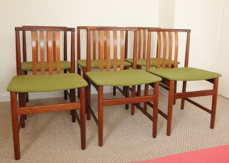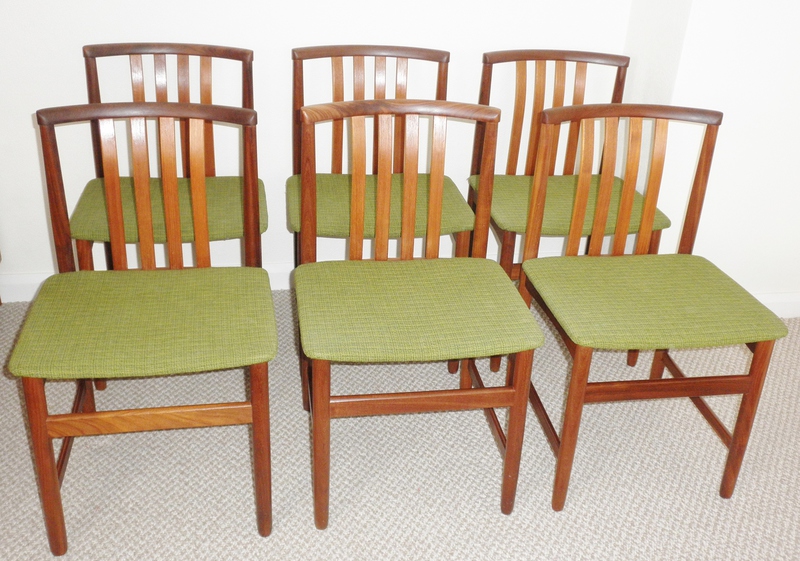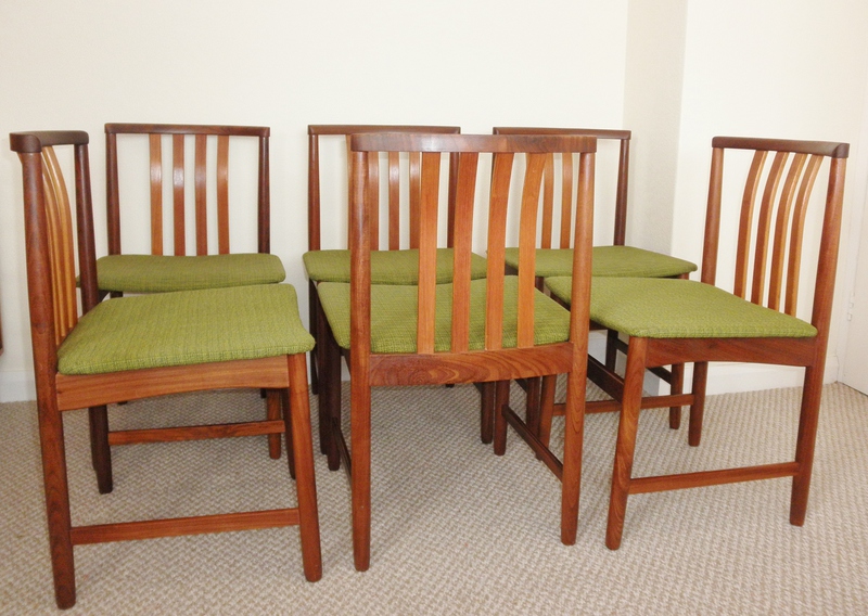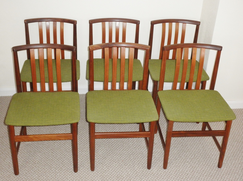 Dating from the early 1960s this sturdy set of six Danish dining chairs, constructed mainly from afromosia featuring an attractively curving top rail above four central back slats in a lighter teak forming a very pure set of early mid-20th century chairs in excellent original condition including the upholstered green seats pads.