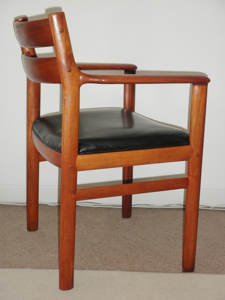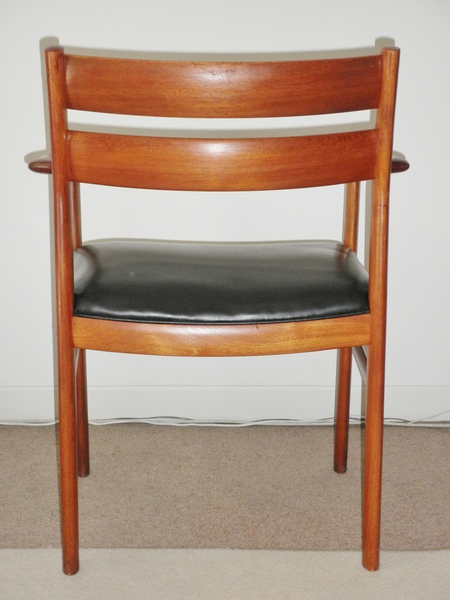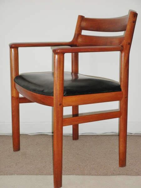 A Danish open armchair dating from the 1960s, having an attractively shaped solid teak frame with a generously broad black vinyl seat and attention was clearly given to the seating position as the two back bars are gently curved to aid comfort. The frame also features nicely shaped armrests and is in good, sound condition, and the seat has a new replacement foam insert and a very small nick in the vinyl.