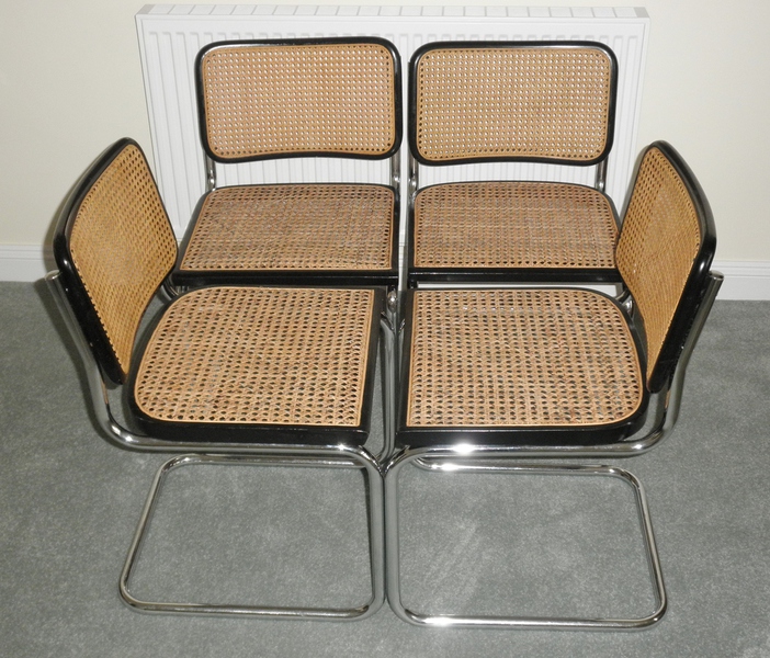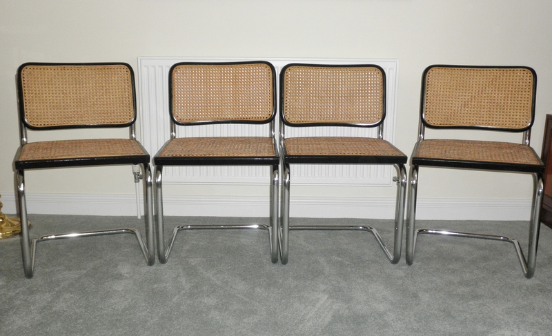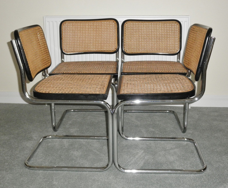 A matched set of four chrome cantilever Cesca chairs designed by Marcel Breuer in 1928, during his time at the Bauhaus, and called the ‘Cesca’ chair after his daughter, Francesca. Known for their flexibility and comfortable seating position, these chairs continue to be very popular and are justifiably considered a stylish timeless classic.