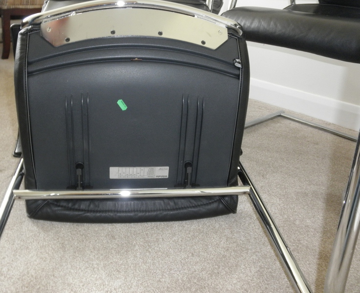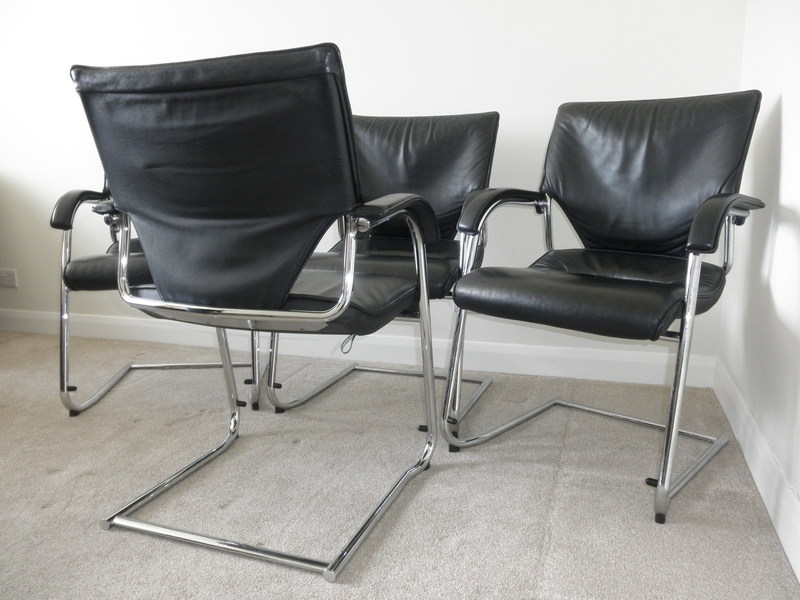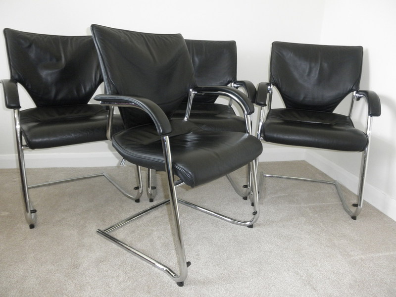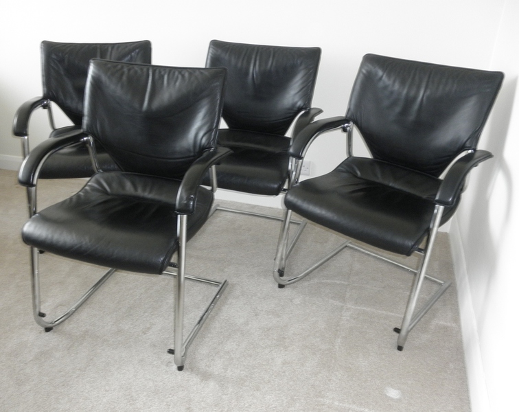 Known for their quality products, these four Modus Executive model cantilever armchairs by Wilkhahn of Germany, have extremely strong chromed steel frames adding good flexibility to the comfort of the supple black leather cushioning and leather armrests making a supremely comfortable chair suitable for dining or office purposes.