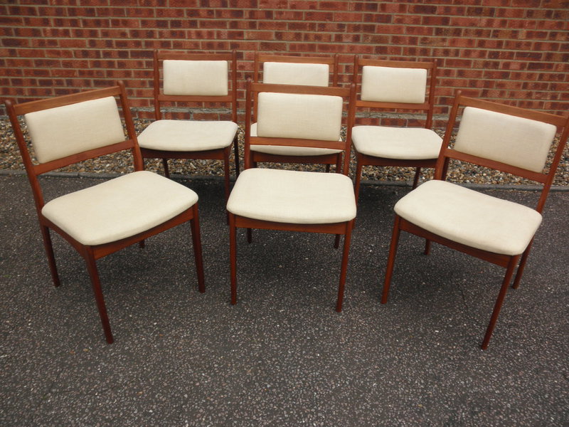 A set of six 1970s Danish style dining chairs having very attractively shaped teak frames with cream linen-look upholstered seats and integral back rests (possibly a linen/polyester mixed fabric for durability). The cream coloured fabric contrasts beautifully with the warm patina of the gently sculptured teak frames producing a very good-looking and comfortable set of mid 20th century vintage dining chairs in excellent and original condition.