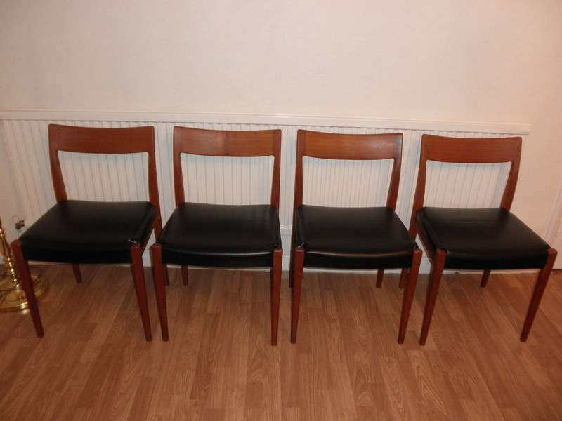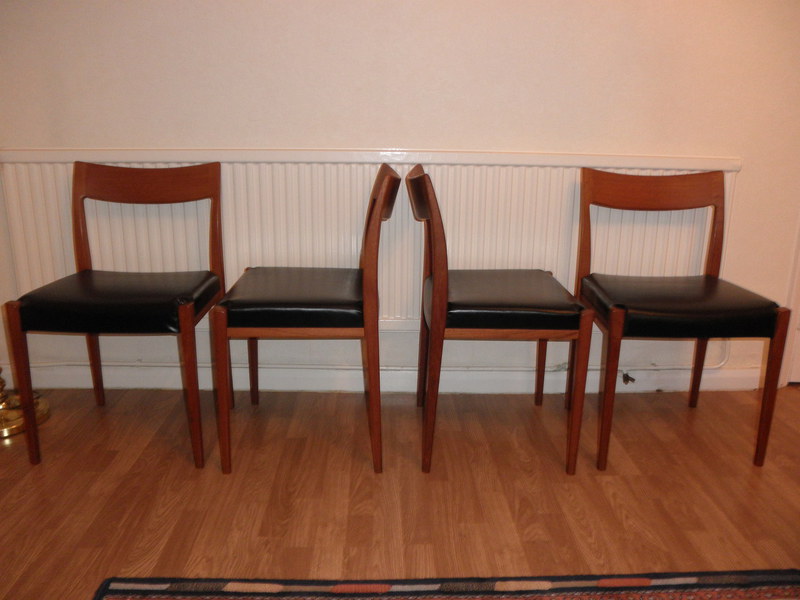 These classic and stylishly shaped chairs have a beautifully shaped back rest rising from the frame, enhanced by the recently reupholstered black vinyl seats, resulting in a sturdy and desirable set of chairs that are a fine example of Scandianvian mid-20th century modern design. All the frames and vinyl seat covers are in very good condition.
