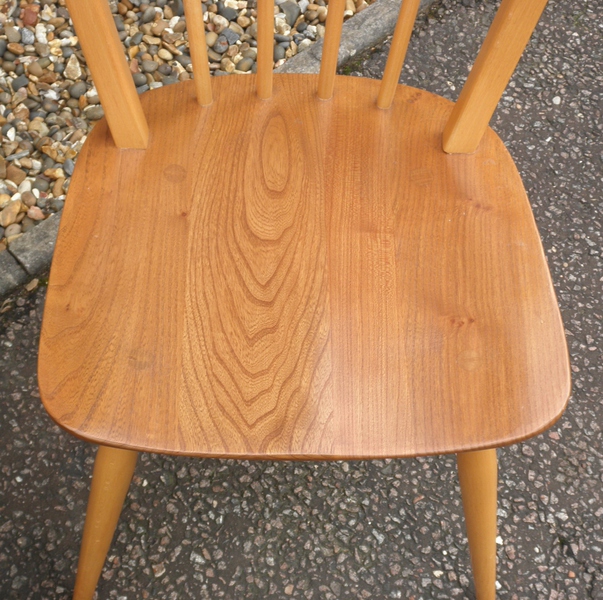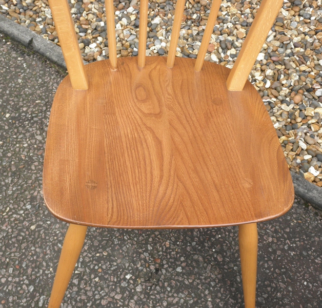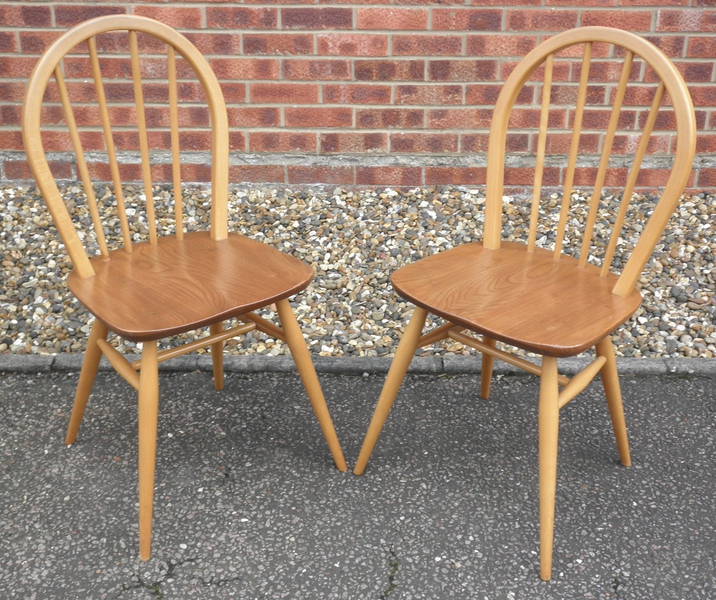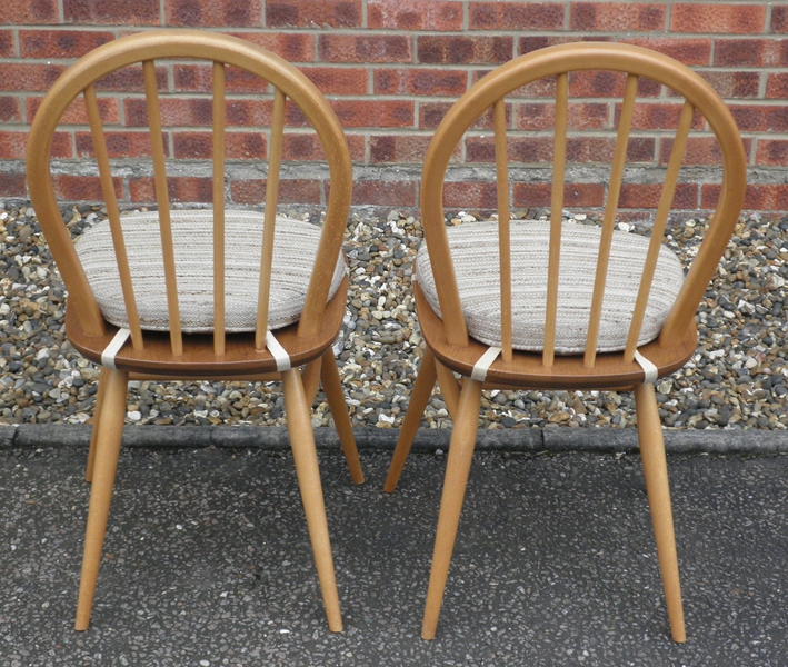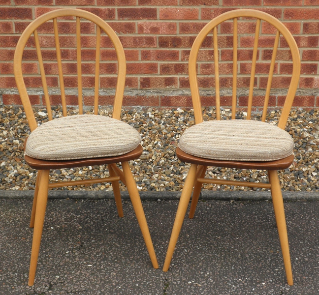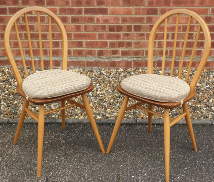 Pair of Ercol Windsor dining chairs in light finish, excellent original condition together with the seat pads covered in a typically 1970s style light oatmeal and brown striped wool.
