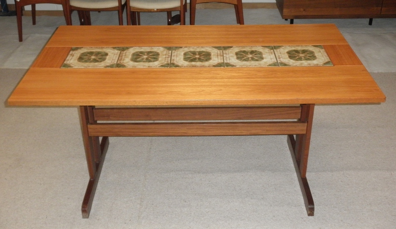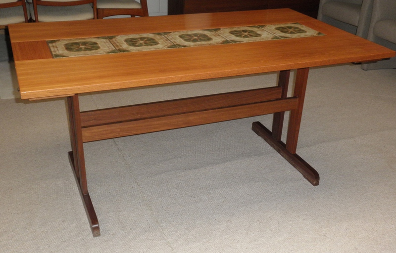 Gangsø Møbelfabrik, Denmark, produced this style of teak, drop leaf, extending table with a central section of very attractive ceramic tiles and is ideal for regular use as a 6 seater or, when extended, is capable of seating 10/12 people. The extending leaves simply hook onto either end of the table for easy removal and storage or can be left in the drop-down position if preferred.