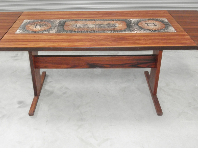 Produced by Gangsø Møbelfabrik, Denmark, in a mid-century-modern refectory style this rectangular rosewood dining table dates from the 1970s, featuring inset central tiles with detachable draw-leaf extending ends.