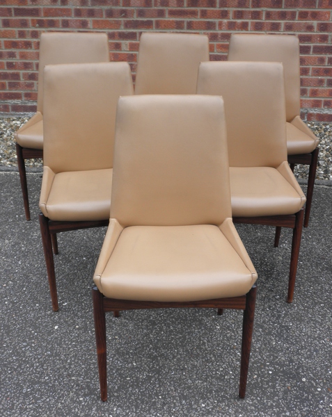 Also available is the set of six “Hamilton” rosewood dining chairs, again designed by Robert Heritage for Archie Shine. The frames are in excellent condition and covered in the original, light tan coloured leather with no tears and very minimal signs of wear commensurate with careful use.