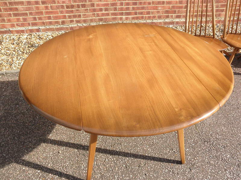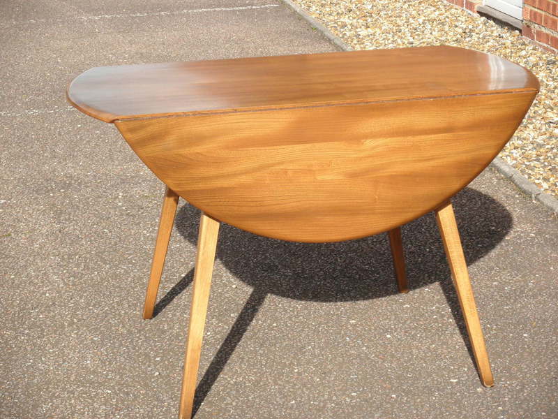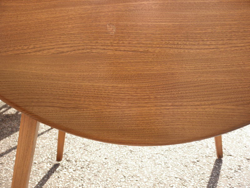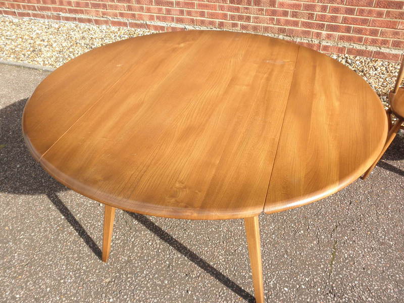Raised on splayed tapering beech legs, the solid elm table top (designed to seat 6 people) converts from an oblong to the circular shape by means of the two semi-circular leaves which are supported by sturdy pull out metal rods and beech blocks. The table is in very good condition apart from one leaf having sustained a dent shown in one of the photos and is reflected in the price.