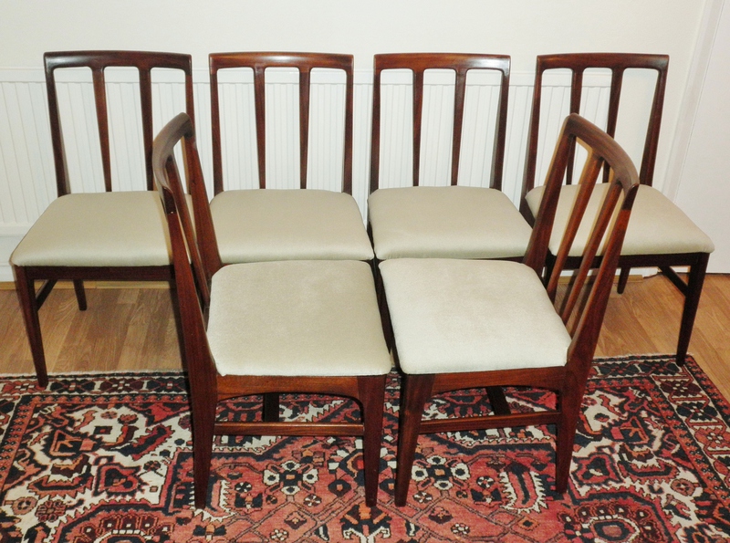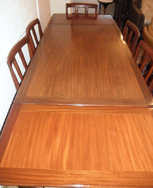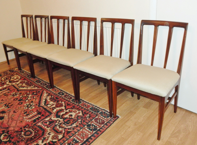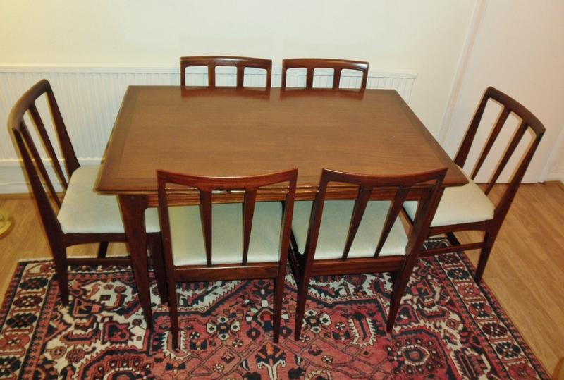 The very generous dining chair seats have been completely reupholstered and the whole set is in beautiful vintage condition having no loose joints and only minimal scuffing due to the strength of the afromosia and clearly very careful usage.