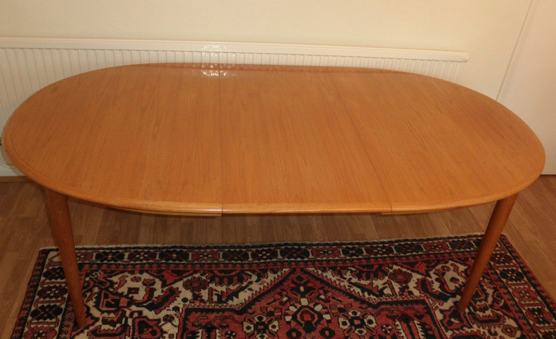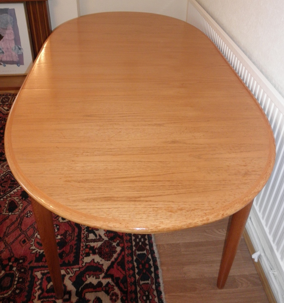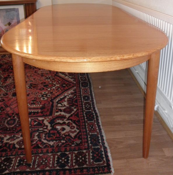 A mid-20th century Danish light teak dining table in oval form which extends with two additional leaves to an extremely long dining (98½”/250cm max), meeting or boardroom table. The table can comfortably seat 10 people or more and the two additional leaves can be stored in a niche under the table surface when not in use. Raised on four round and tapering, detachable legs and the top surface has a ‘D’ or thumb shaped edge has minimal signs of colour change – with only one of the two extra leaves being slightly darker where it has been seldom used.