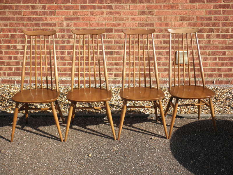 A matching set of four instantly recognisable classic Ercol Model 369 Goldsmith chairs in the Golden Dawn finish. Made from solid beech and elm with elegantly sloping back rests of 5 spindles and 2 turned columns rising to a distinctively shaped back rail and the seat is pierced by the traditional Ercol turned and outwards sloping legs with an H stretcher.