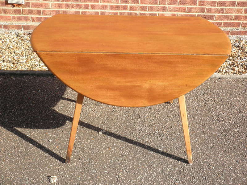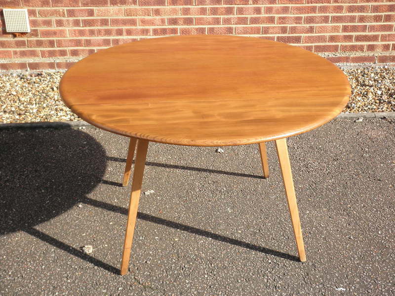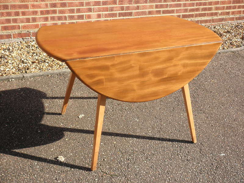 Raised on splayed tapering beech legs with a solid elm top (designed to seat 6 people) converts from an oblong to a circular / oval by means of the two semi-circular leaves supported by sturdy pull-out metal rods and beech blocks.